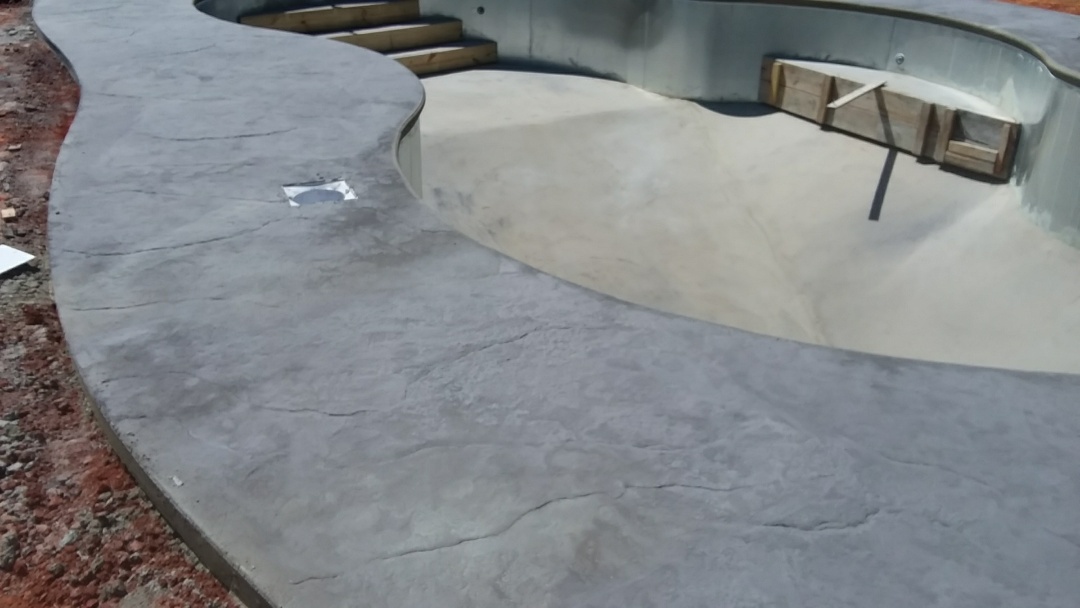 16x34 oasis New pool installation with stamped concrete.