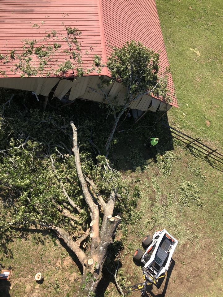 Removing storm blown Red Oak from back side of pole barn, grinding stump, and removing all debris