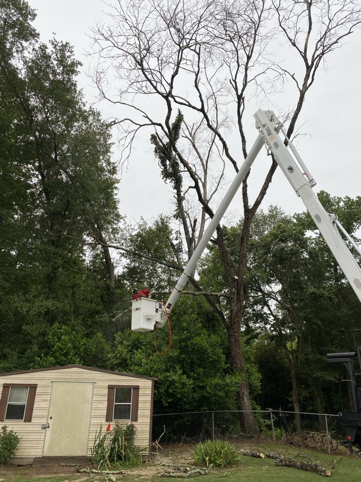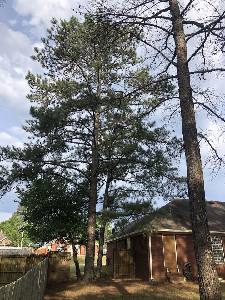 Raising canopy on multiple trees around side and backyard, grinding stumps, and cleaning up all debris. Also taking down green pine and dead Sweetgum.