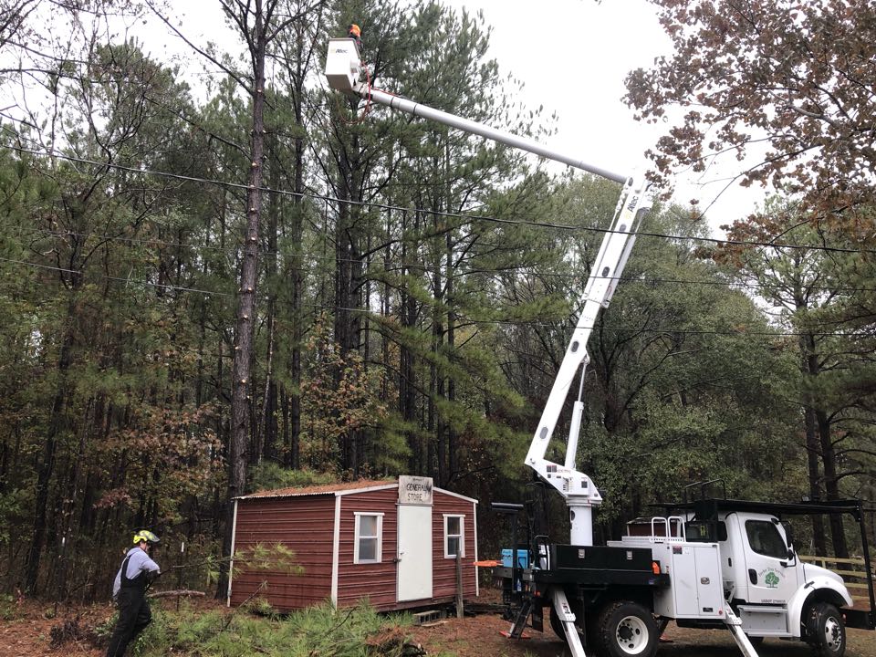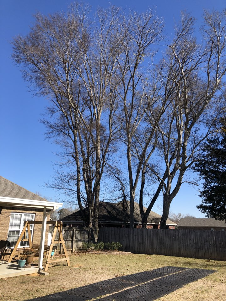 Removing dead pine hung up, dead Sweetgum, leaning green line, and dead Water Oak. Also grinding stumps and cleaning up debris
